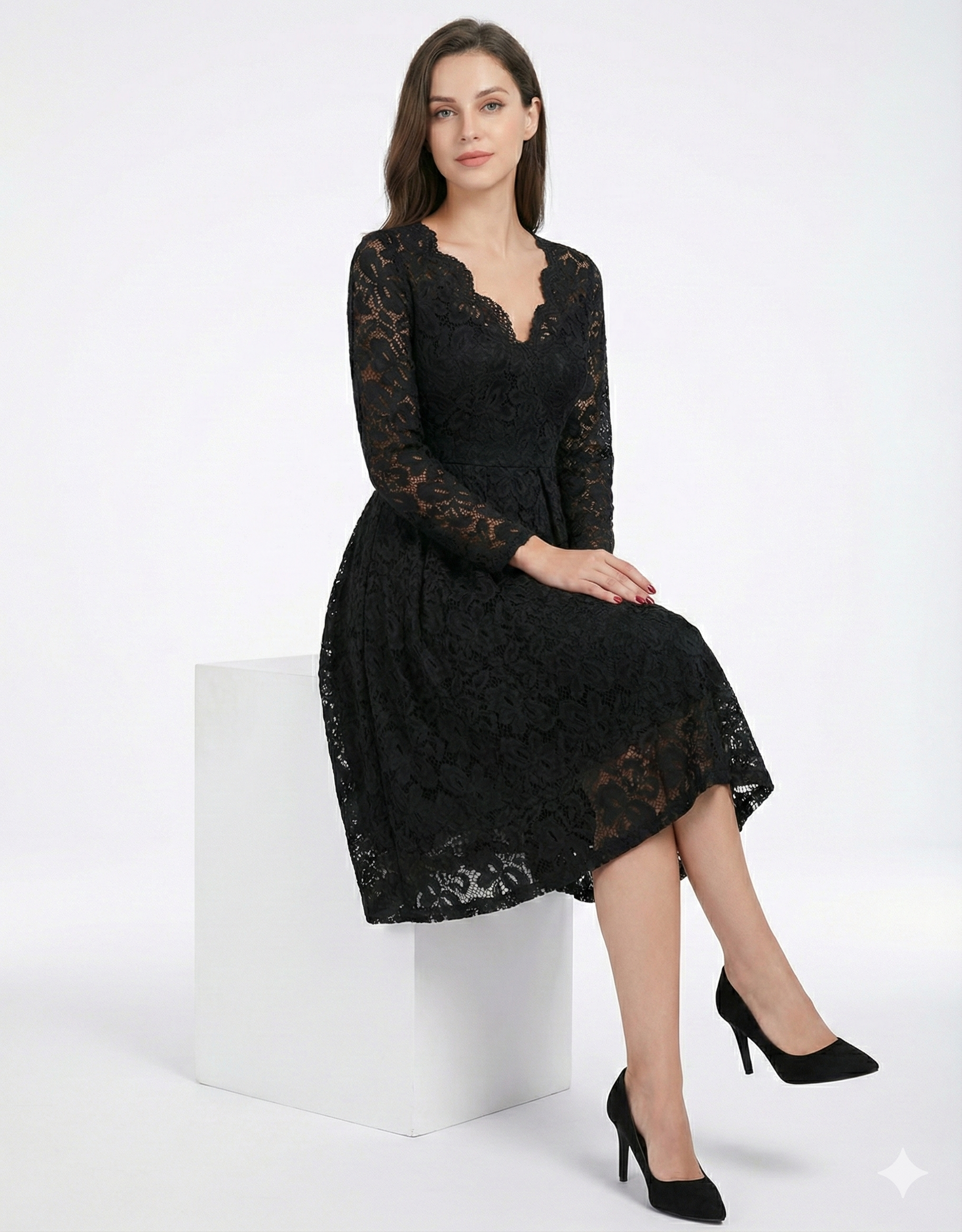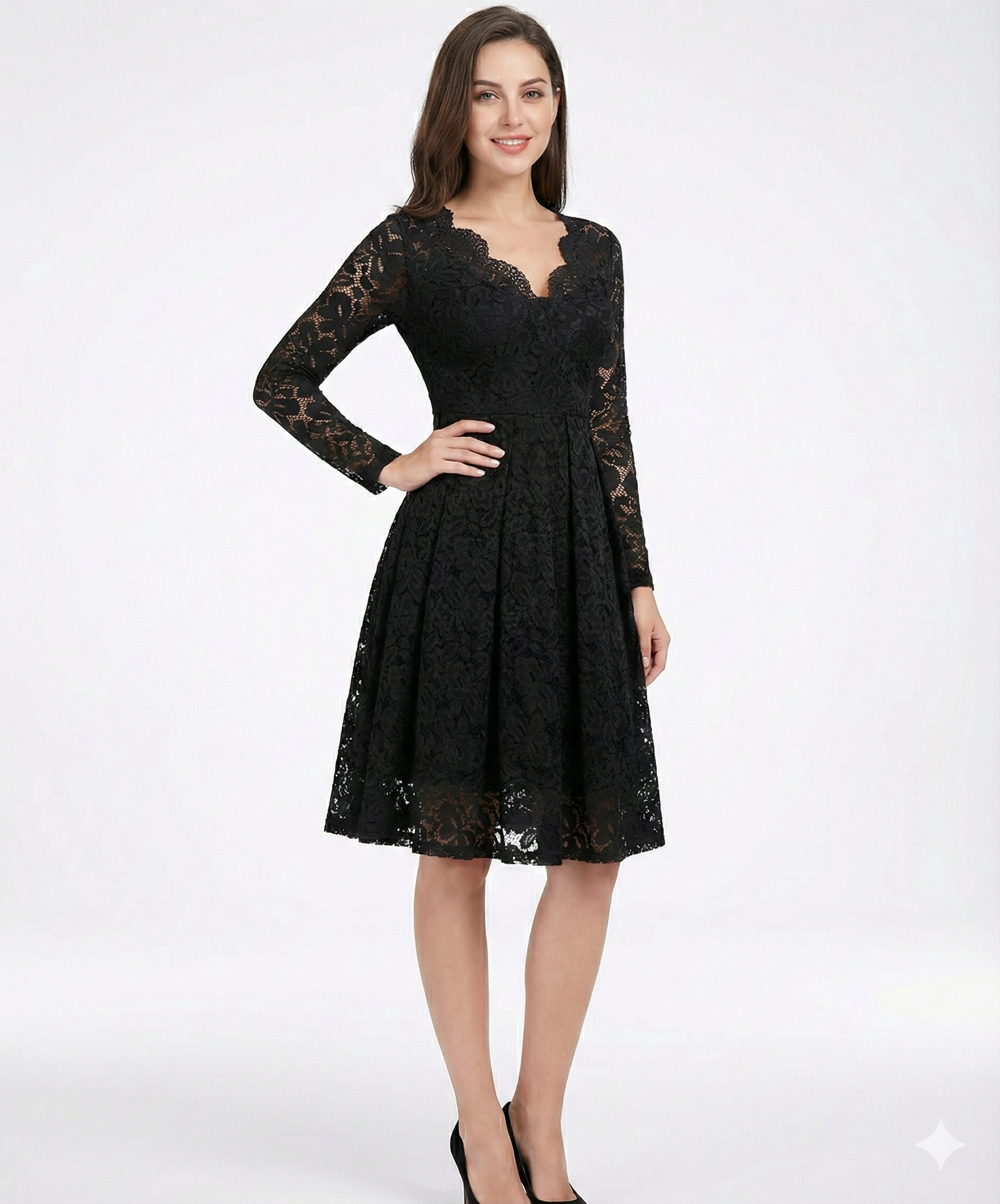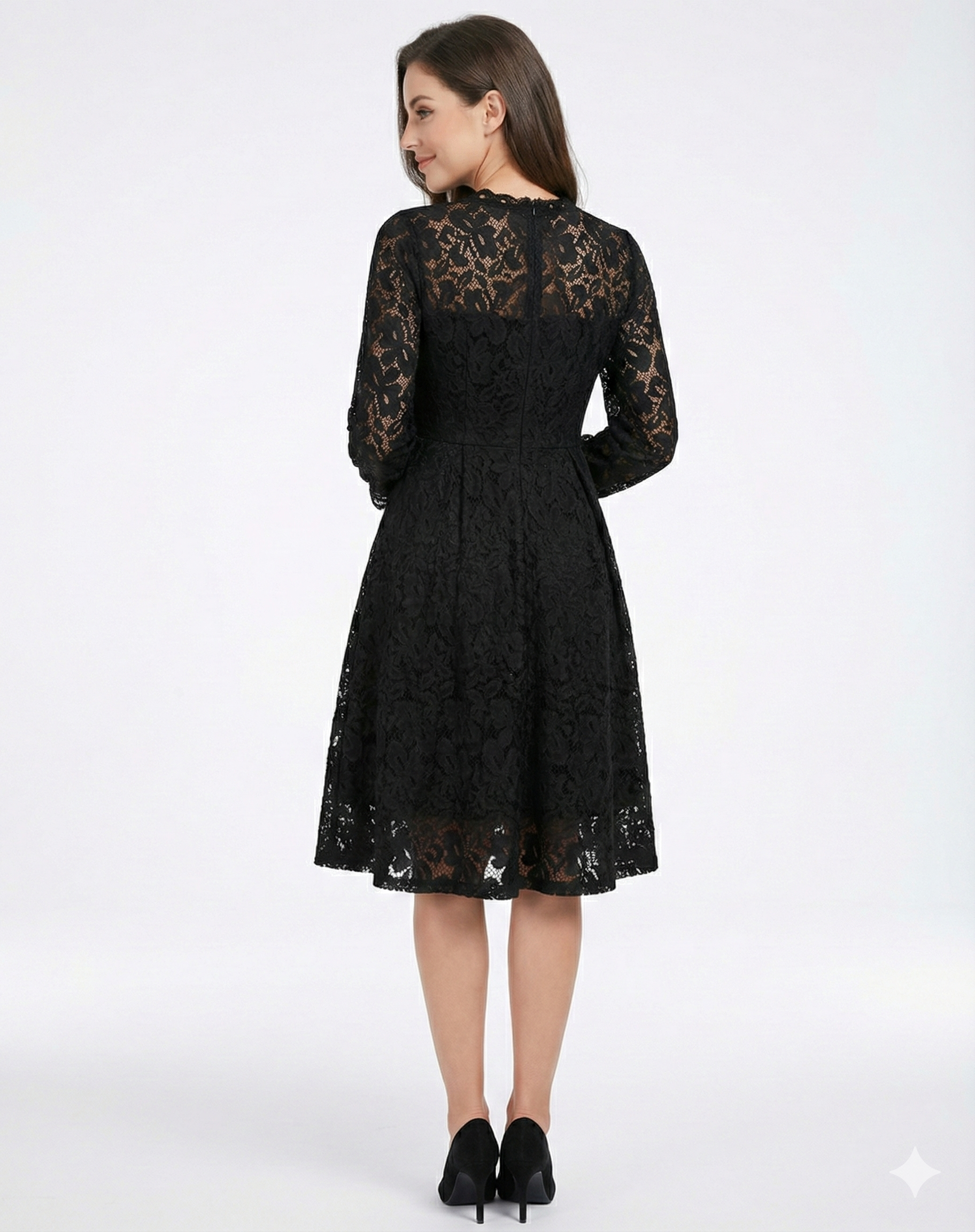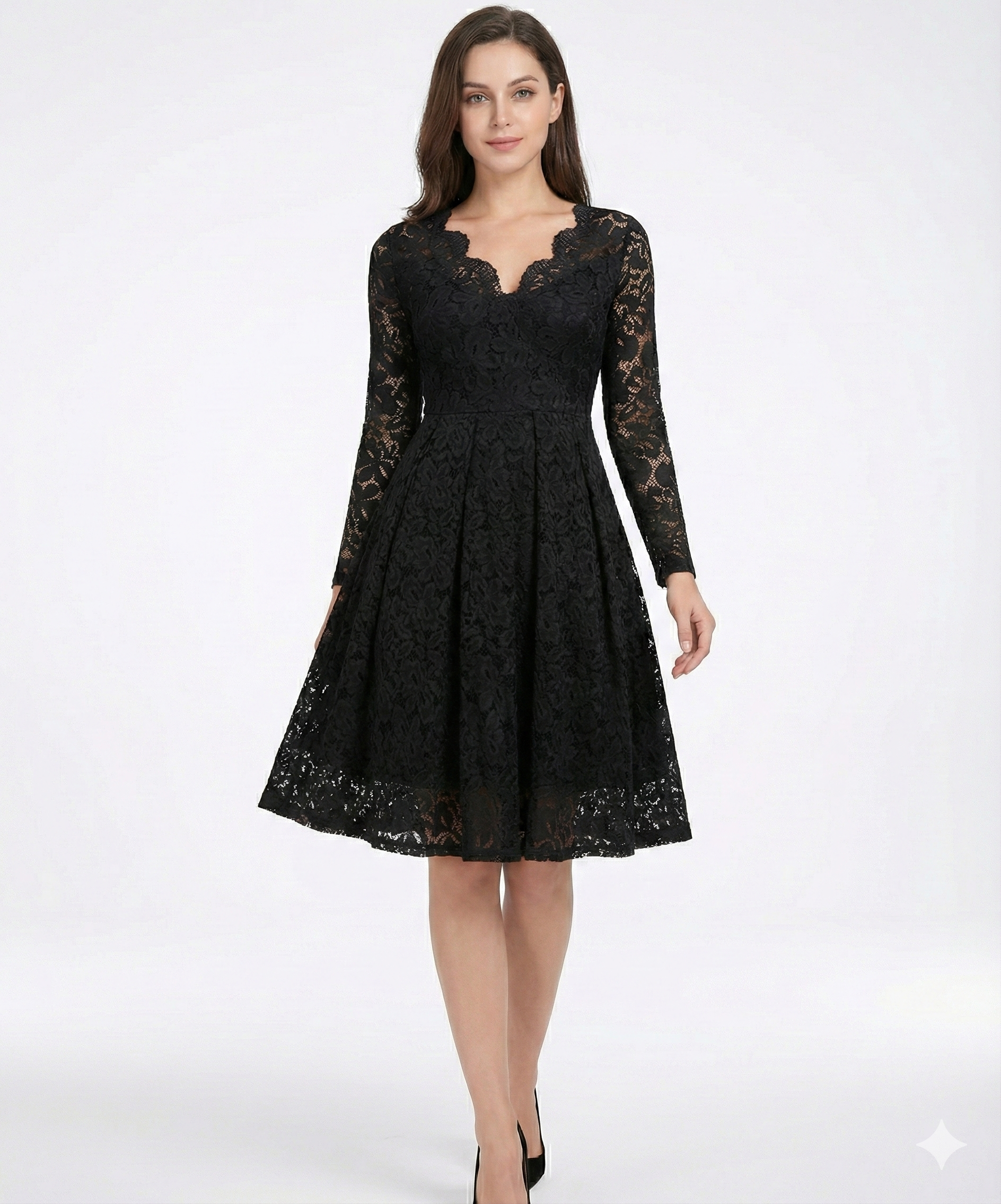 Cette robe noire sophistiquée sublimera votre silhouette pour toutes vos occasions spéciales. Son corsage orné de dentelle florale et ses délicates paillettes capturent la lumière à chaque mouvement. La partie transparente au décolleté apporte une touche de sensualité raffinée, tandis que les manches longues en dentelle créent un contraste saisissant avec la jupe évasée en mousseline qui virevolte gracieusement jusqu'aux genoux, offrant une fluidité exceptionnelle avec sa fermeture invisible au dos.